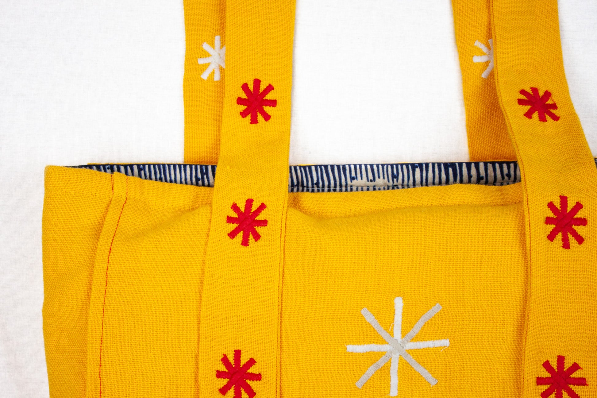 Made from recycled materials that help divert textile waste from landfill. This one-of-a-kind slouchy tote combines heavyweight linen, checked wool tweed, and hand-block printed cotton. Bold and textured, the design is brought to life with detailed embroidery and appliqué
