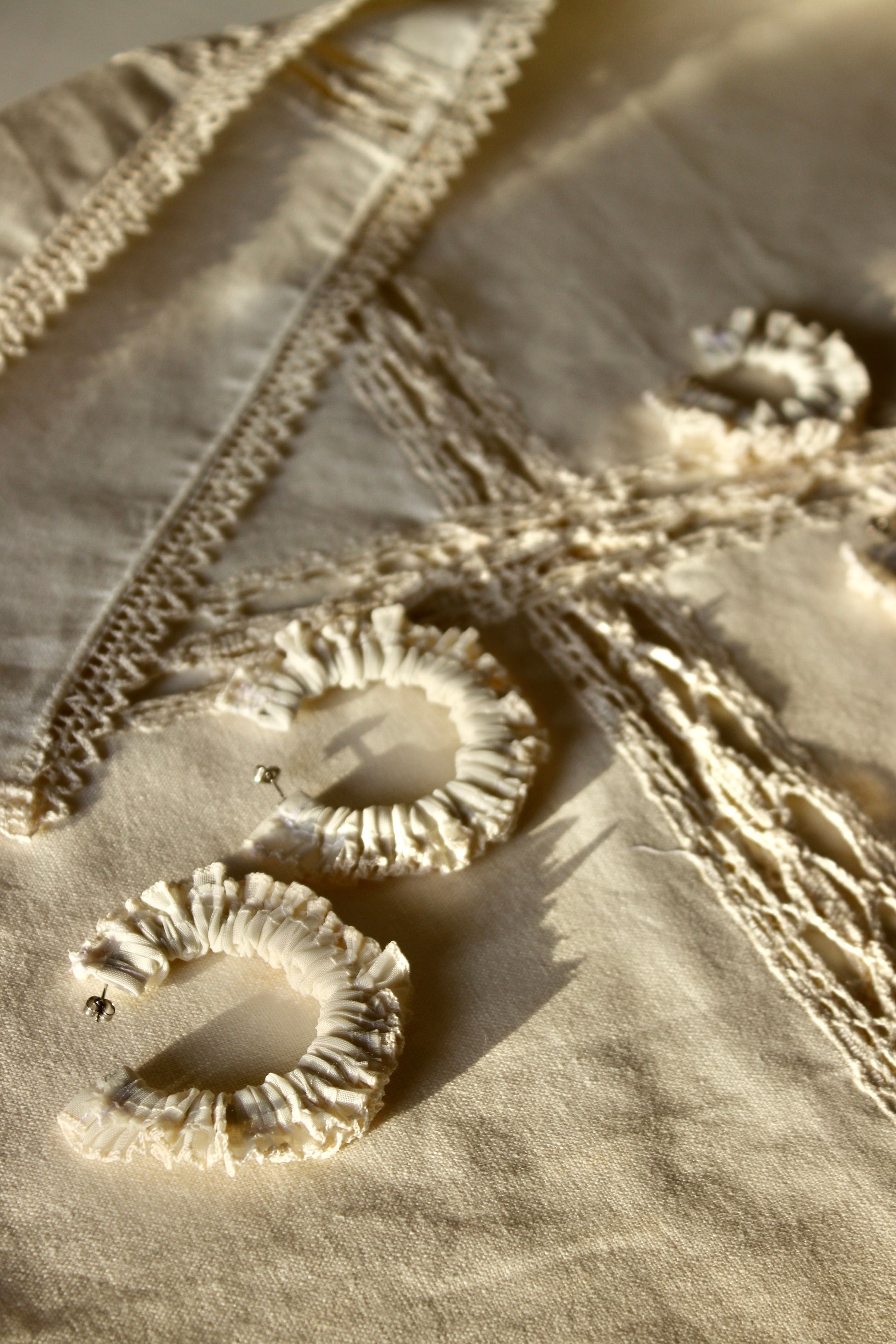 Made from recycled materials, these earrings are made from an ivory mesh pleated fabric. The metal used for the body of the earring is a hypoallergenic stainless steel.