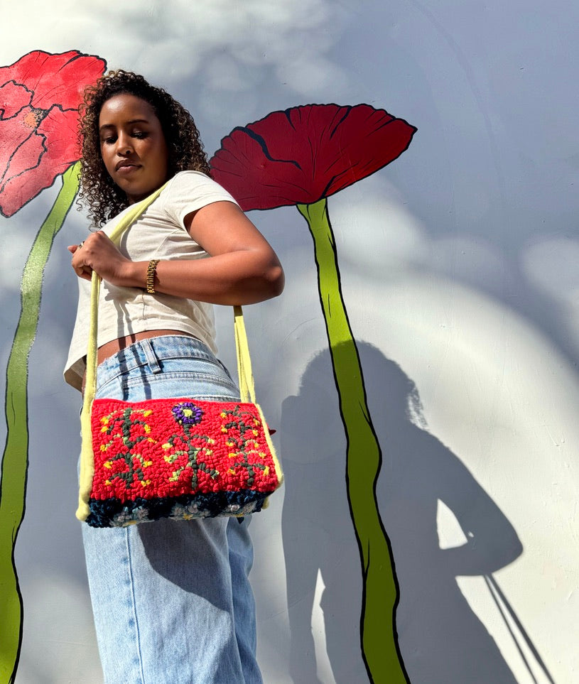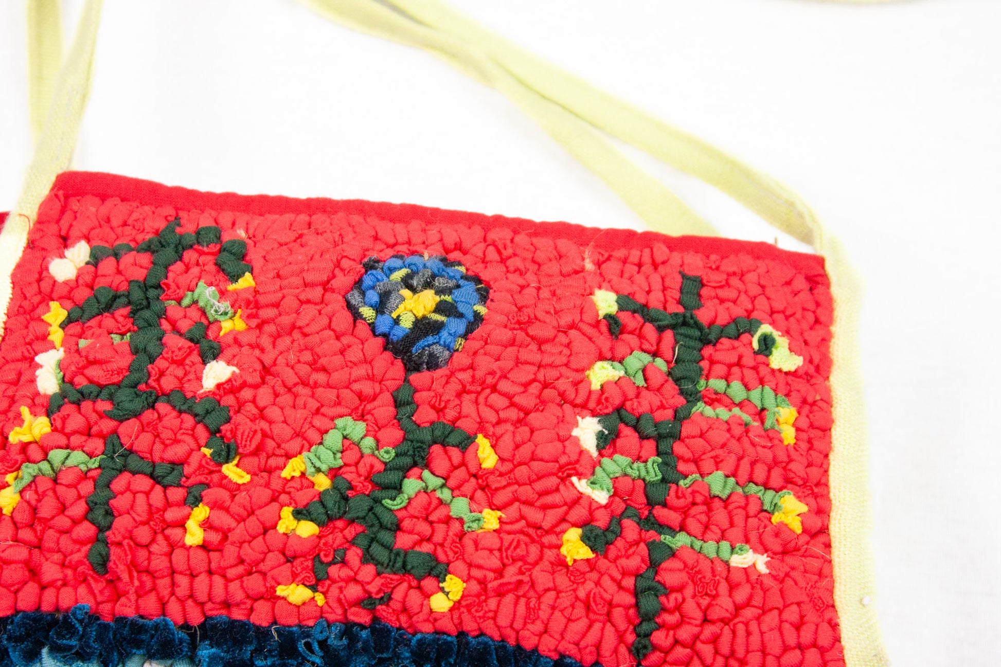 This bag is made using a traditional rug-making technique called hooky rag-rugging. Like many crafts, rag-rugging was originally born out of necessity, but today is about the pleasure of craft and the importance of recycling. It is a laborious process where thin strips of fabric are pulled up through a piece of hessian using a hook creating small loops. The outcome has the most wonderful texture and durability.