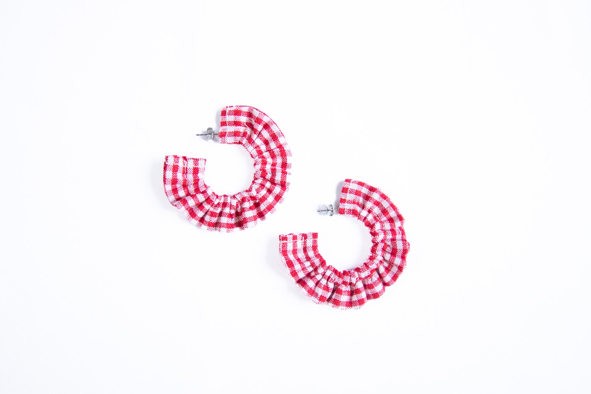 Made from recycled materials (as always!), these earrings are made from a red gingham cotton. The metal used for the body of the earring is a hypoallergenic stainless steel.